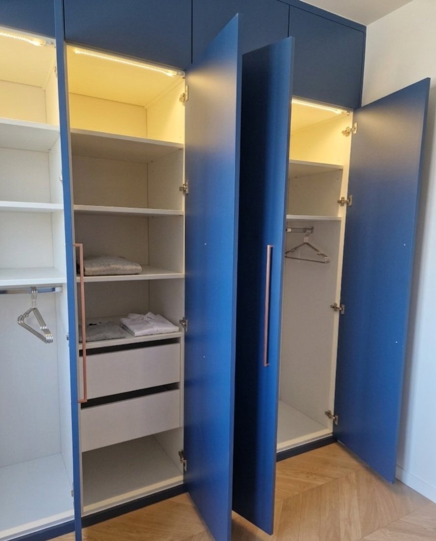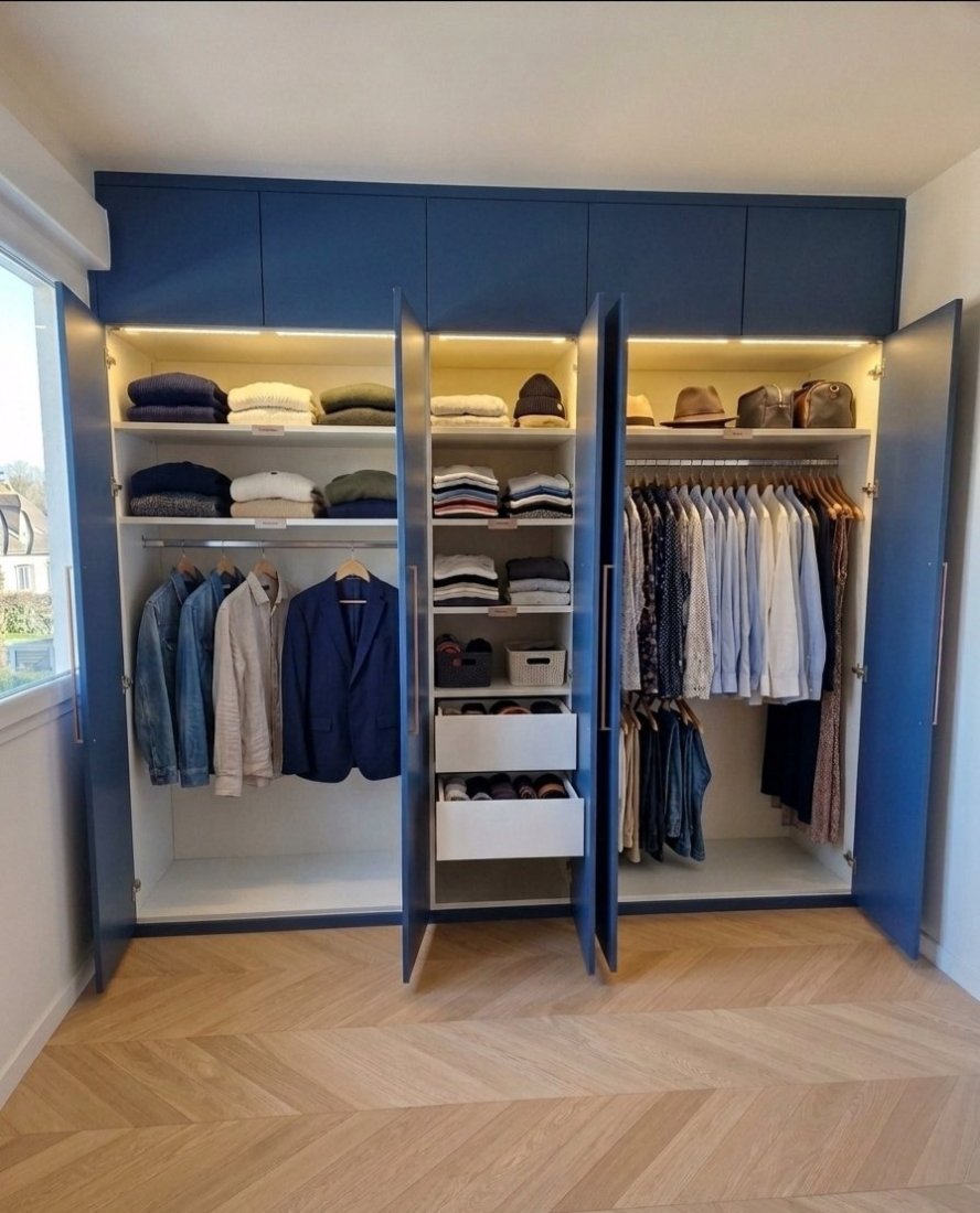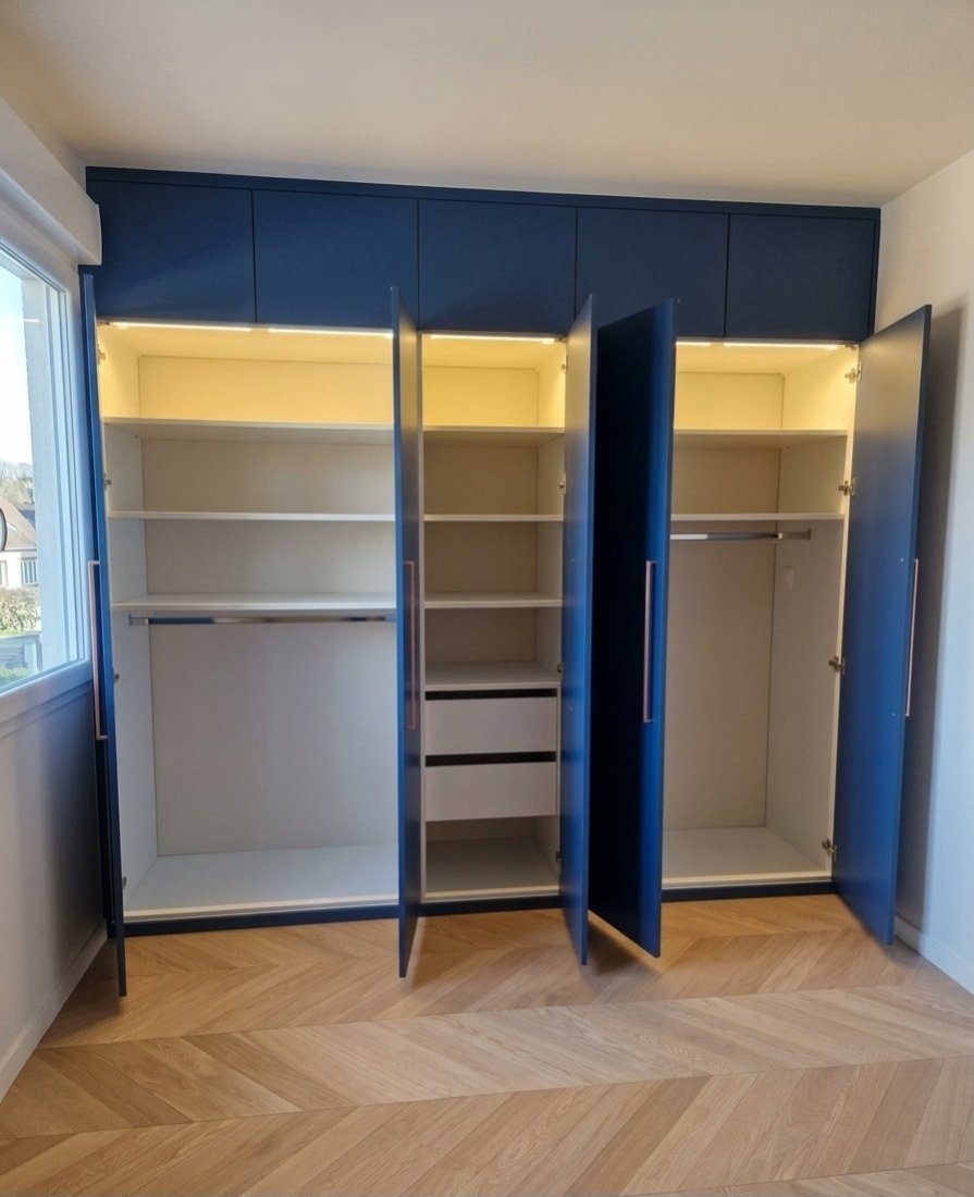 Nous avons également intégré un grand placard quatre ouvrants, pensé pour maximiser le rangement tout en restant esthétique. Sa finition bleu cosmique Egger lui confère une identité forte et contemporaine, créant une ambiance apaisante et moderne dans la pièce.