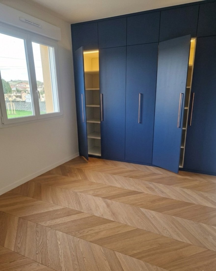 Superbe chambre designée par GA CREATION : parquet chêne en pointe de Hongrie, placard à portes bleu cosmique Egger avec éclairage intégré s’allumant à l’ouverture pour une ambiance raffinée et fonctionnelle.